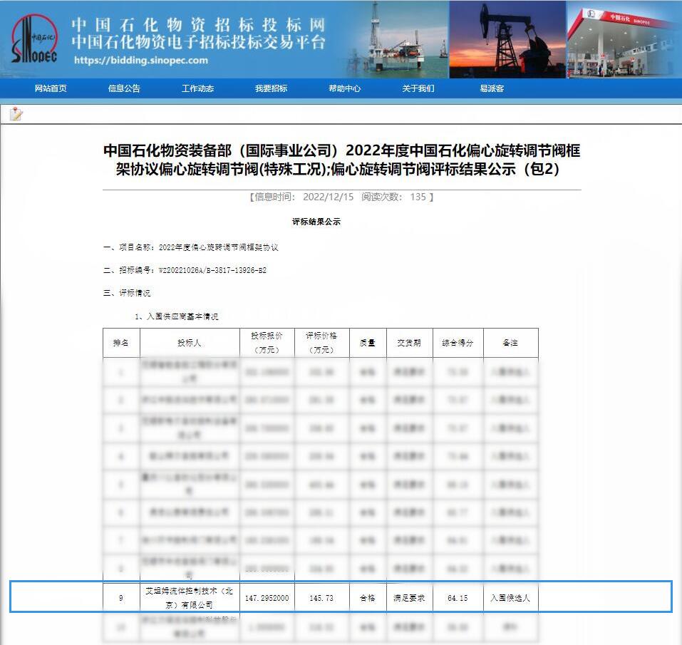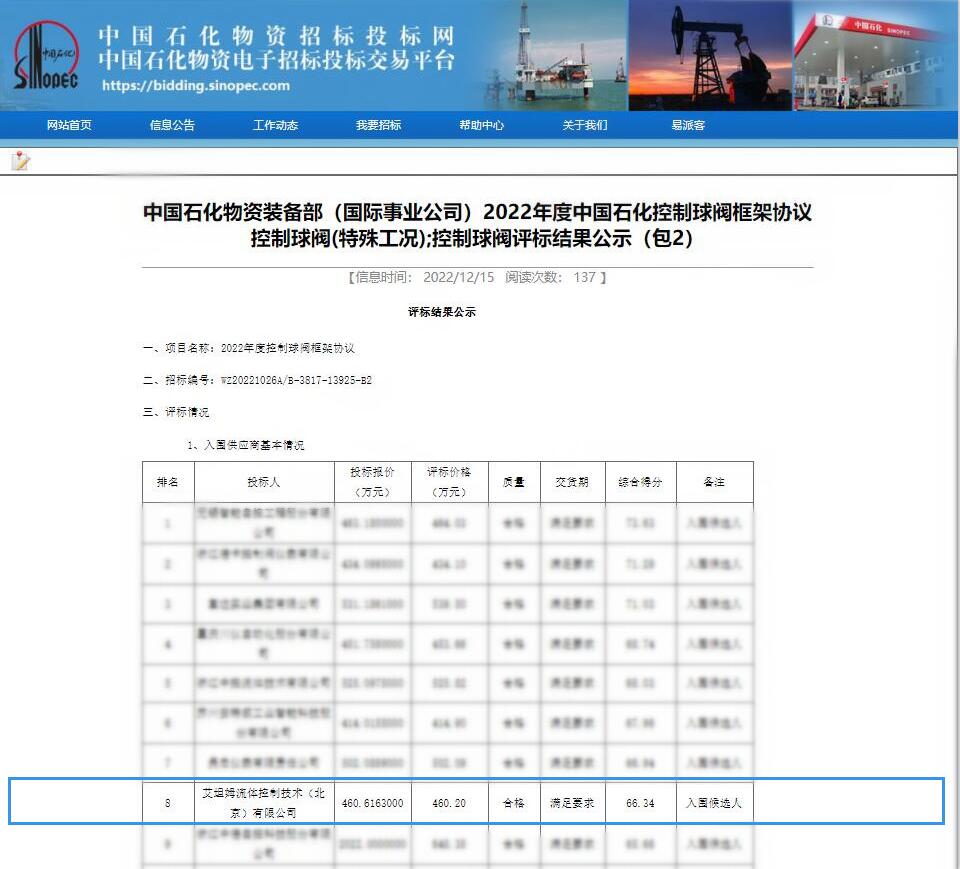 中石化是世界500强企业,旗下企业遍布全国各地,对供货服务商的选择十分谨慎,对产品的质量要求及其稳定性格外严格。为获得此次入围机会,艾坦姆深度解读招标文件中的技术及商务条款,认真组织投标文件,经过中石化对公司规模,销售业绩,产品性能,服务模式,技术方案等进行多维度严格审核把关后,艾坦姆调节阀、控制球阀、偏心旋转调节阀成功入围2022年度中石化框架。